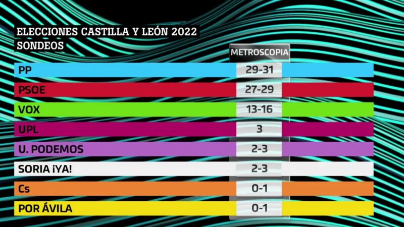 En esta línea, Vox daría el pelotazo este domingo al pasar, según Metroscopia, de un escaño en 2019 a los 13-16 que lograría ahora, recibiendo el 18,7% de los apoyos; según ABC/GAD3, la extrema derecha lograría entre 11 y 13 escaños; según SIGMADOS, entre 10 y 12. Esto permitiría consolidar al bloque de la derecha, que necesitaría pactar para obtener el nuevo Gobierno de Castilla y León. Y frente al gran ascenso de la extrema derecha, el batacazo de Ciudadanos: según Metroscopia, la formación naranja podría perder todos o casi todos los escaños que consiguió en 2019 (pasaría de 12 a no tener ninguno o a obtener el de Francisco Igea por Valladolid con el 4%).