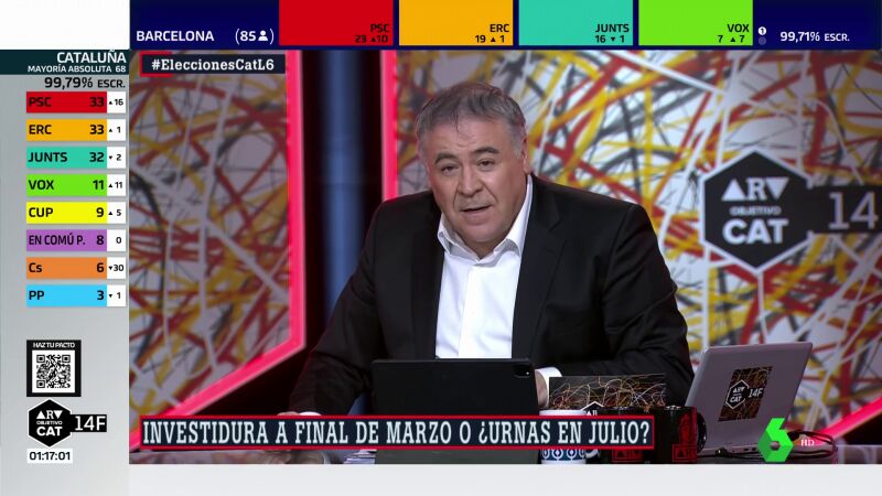 Uno de los momentos más destacados lo protagonizaron el candidato de Esquerra Republicana, Pere Aragonès, y Antonio García Ferreras. El plató de Al Rojo Vivo conectó con el líder de la segunda fuerza más votada tan pronto como se supieron los resultados definitivos. Ante esto, el presentador preguntó al catalán sobre la intención de Salvador Illa de ser investido como president. "Muy bien, pues yo también", respondía Aragonès.
