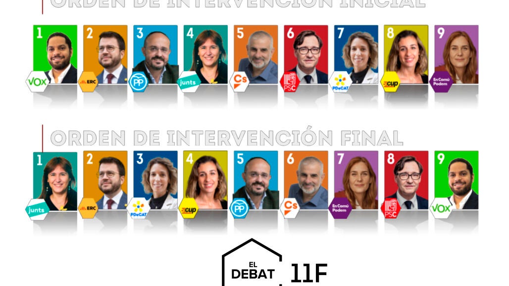 Las posiciones de los nueve candidatos, de izquierda a derecha como se verán en pantalla, es el siguiente: Aragonès (ERC), Carrizosa (Cs), Garriga (Vox), Borràs (Junts), Fernández (PP), Estrada (CUP), Albiach (En Comú Podem), Illa (PSC) y Chacón (PDeCAT).