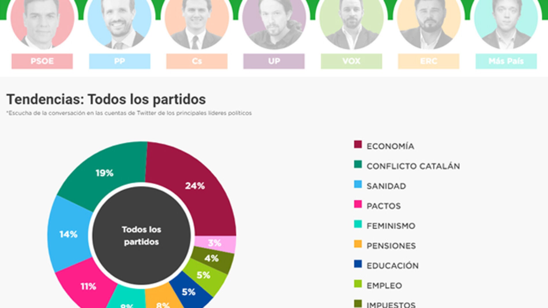 Ahora, pincha sobre cada uno de los principales candidatos y partidos que verás en la herramienta para conocer las principales tendencias que han marcado su conversación en la campaña electoral previa al 10N. La escucha se realiza sobre las cuentas oficiales de PSOE, PP, Ciudadanos, Unidas Podemos, Vox, Más País y ERC, junto a una selección de cuentas pertenecientes a distintos líderes de cada formación (aparecen indicadas en la propia herramienta).