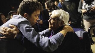 Se miran a los ojos, de cerca. Ella le coge por debajo de los brazos, él los coloca sobre los hombros de ella. Podrían ser abuela y nieto. Parecen abuela y nieto. Pero no lo son. Son una militante y un candidato. La militante, emocionada e ilusionada con el nuevo candidato a la presidencia del Gobierno que pide "votar distinto" en estas elecciones.