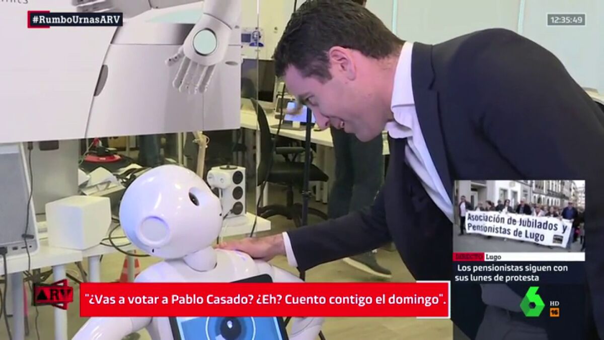 El secretario general del PP, Teodoro García Egea, ha visitado las instalaciones de la empresa Casual Robots en Madrid. Allí no ha dudado pedir el voto para su partido a uno de los robots. "¿Vas a votar a Pablo Casado? ¿Eh? ¿Cuento contigo el domingo?", le ha preguntado García Egea.