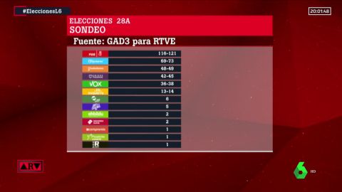 Unidas Podemos lograría el 16,1% de los votos y 42-45 escaños. Después, Vox tendría el 12,1% de los votos y 36-38 escaños.
