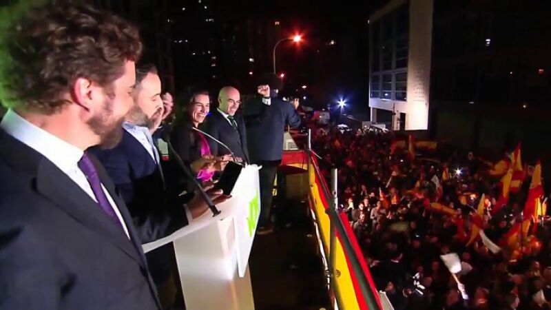 El líder de la formación de extrema derecha, subido a un gran andamio, se ha dado un baño de masas con sus votante. Entre gritos de "presidente, presidente", el líder de Vox ha celebrado los buenos resultados de su partido y ha mandado un claro mensaje: "Los insultos no nos detendrán para lograr una patria de españoles iguales y libres".