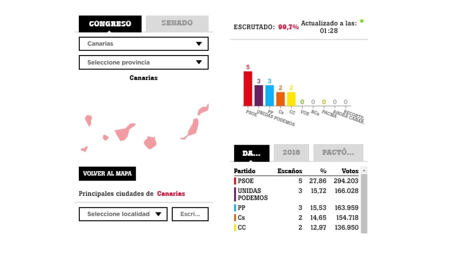 El PSOE gana las elecciones generales en Canarias consiguiendo 5 escaños y un 27,84% de los votos. Esto supone 2 diputados más respecto a las elecciones del 2016.