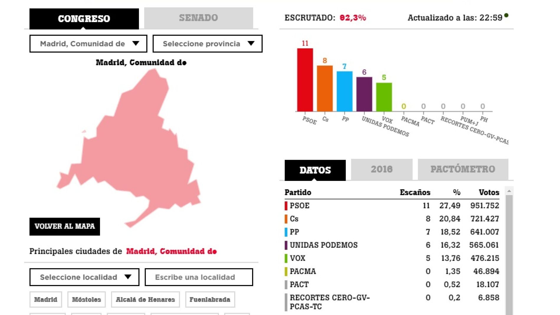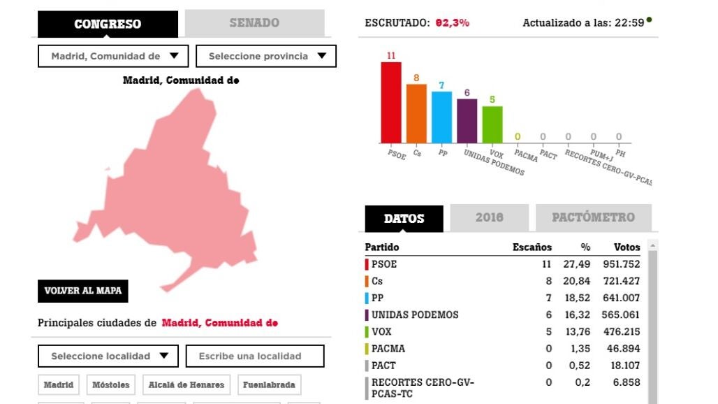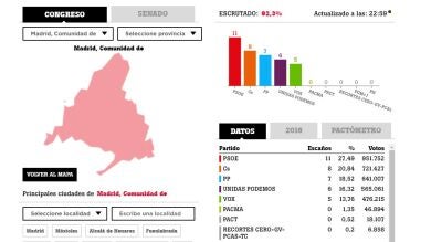 Unidas Podemos, que en 2016 fue segunda fuerza, cae a cuarta con seis parlamentarios y el 16,54 % del voto, mientras que Vox lograría por primera vez cinco representantes madrileños en la Cámara Baja con un apoyo del 13,50% .