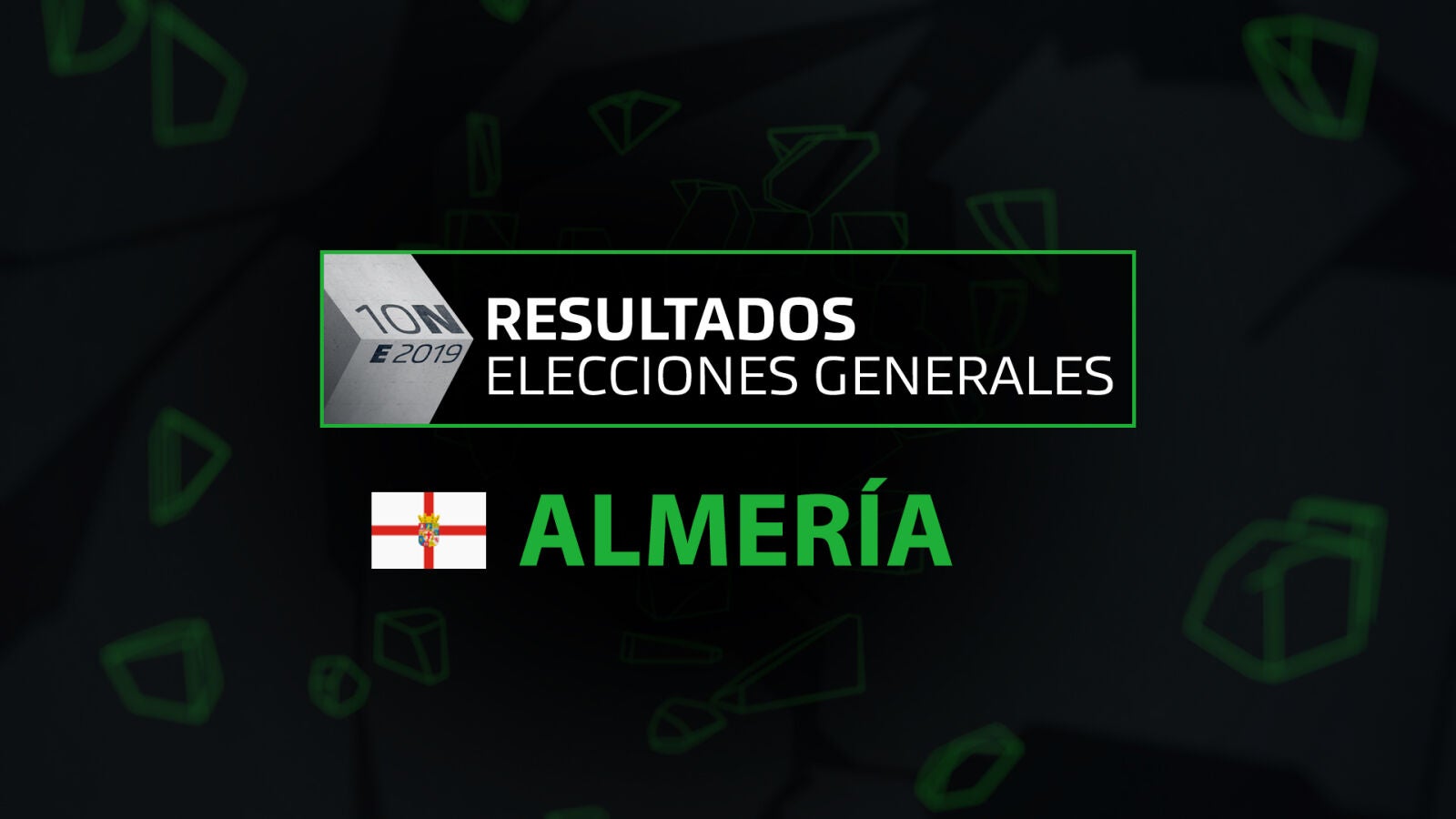 Conoce todos los resultados de las elecciones generales del 10 de noviembre de 2019 en Almería. Número de votos, participación, porcentajes de voto, diputados y senadores al Congreso y Senado. Todos los datos electorales de los partidos políticos en la provincia de Almería.