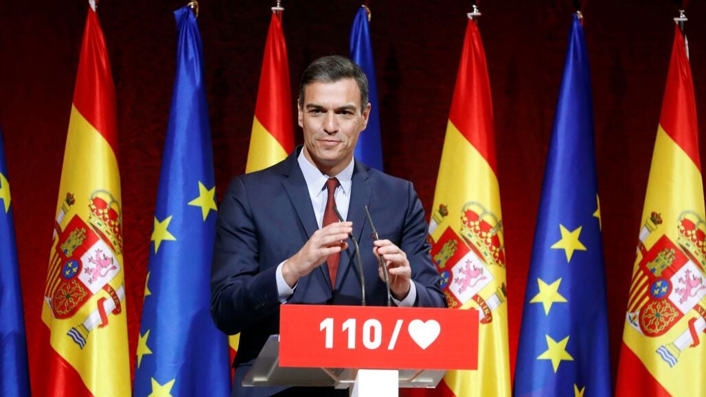 Pedro Sánchez ha presentado su programa electoral para el 28 de abrilrespaldado por banderas de España y Europa.