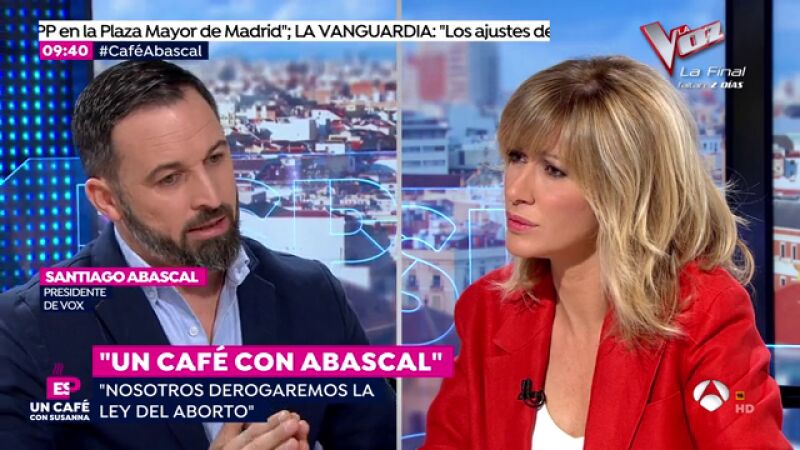 Susanna Griso le ha argumentado que "hay una injerencia a partir del momento que una madre que aborta sea penalizada por ello", a lo que Abascal ha respondido: "Susanna, tu cuerpo es tuyo pero el que llevas dentro no". "Pero si por abortar me vais a llevar a la cárcel", ha insistido Griso, "la injerencia del Estado es más que evidente".