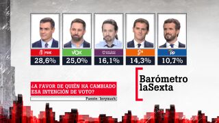 ¿Quién sale beneficiado? El 28,6% cambiaría su voto hacia el PSOE y su candidato, Pedro Sánchez, y un 25% lo modificaría en favor de Santiago Abascal, Vox. En tercera posición, con el 16,1% estaría Pablo Iglesias, seguido por Albert Rivera con el 14,3% de los votos 'repensados'.