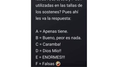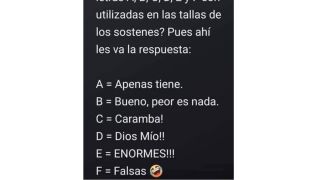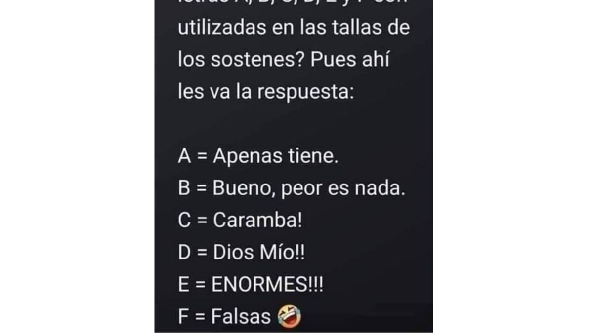 "¿Alguna vez se han preguntado por qué las letras A, B, C, D, E y F son utilizadas para las tallas de los sostenes? Pues ahí va la respuesta: A (apenas tiene), B (Bueno, peor es nada), C (Caramba!), D (Dios mío!!), E (ENORMES!!!), F (Falsas)", dice el post.