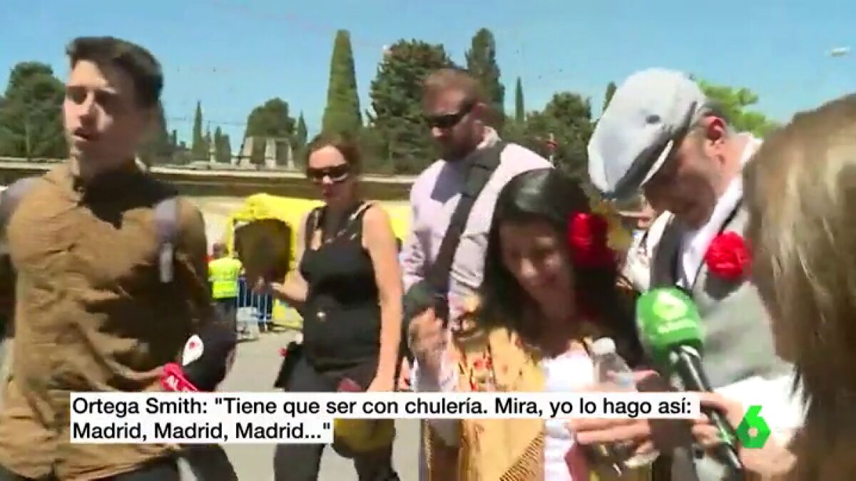 El candidato prefiere esquivar la pregunta de la periodista y le muestra a Rocío Monasterio, candidata de la formación de Abascal a la Comunidad de Madrid, cómo debe de ser "la zancada de San Isidro. Con chulería".