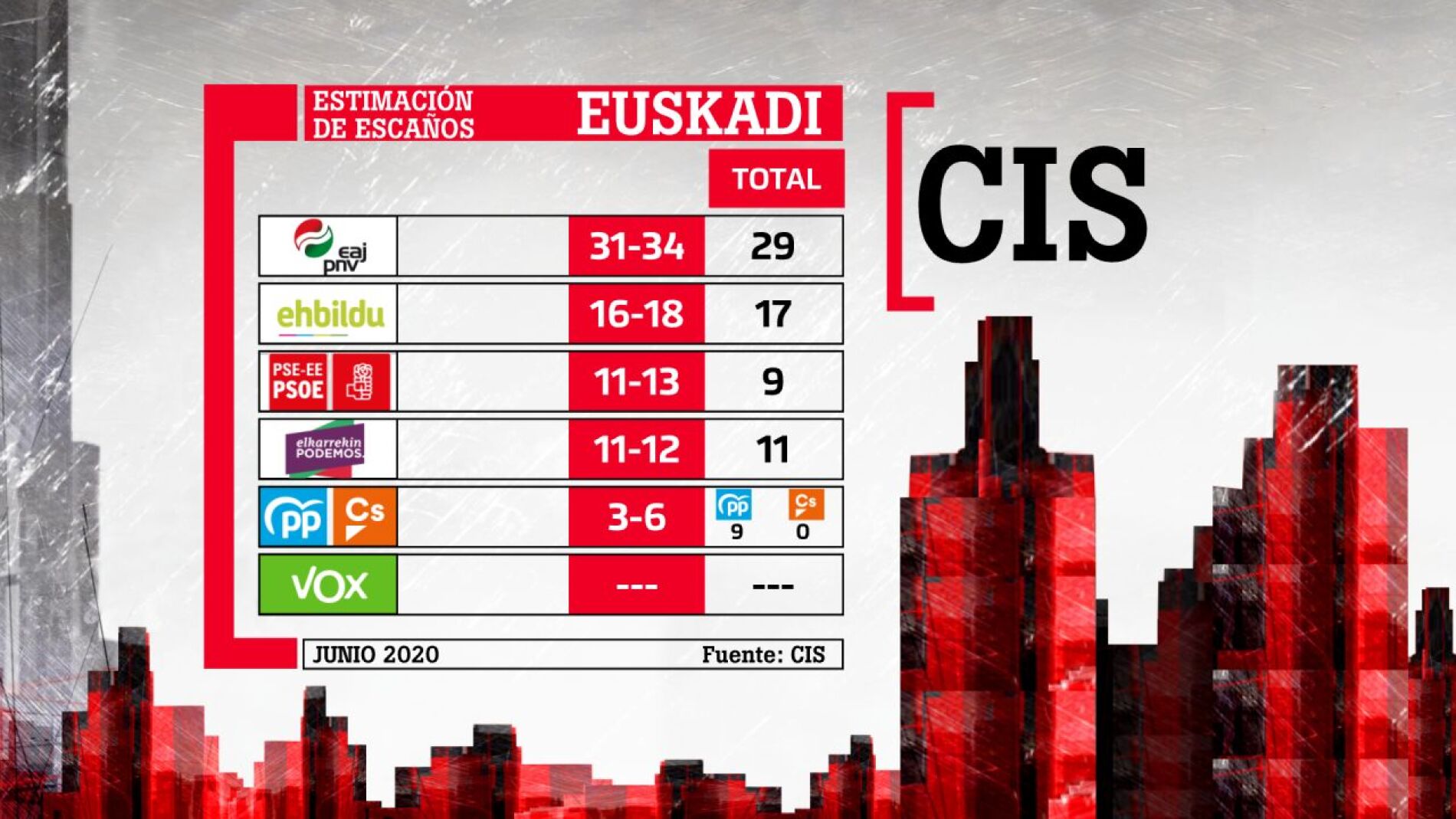 Respecto a las predicciones de la votación en el País Vasco, el PNV, encabezado por Íñigo Urkullu, también repetiría victoria. Es más, según el barómetro, en estos comicios sumaría entre 3 y 6 escaños más (de 28 a 34 escaños en su punto máximo). En segundo lugar quedaría EH Bildu, manteniendo sus actuales 18 escaños o perdiendo un máximo de dos.