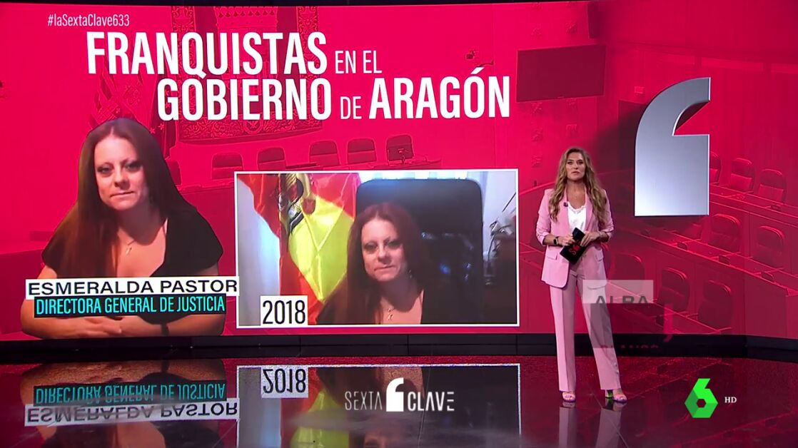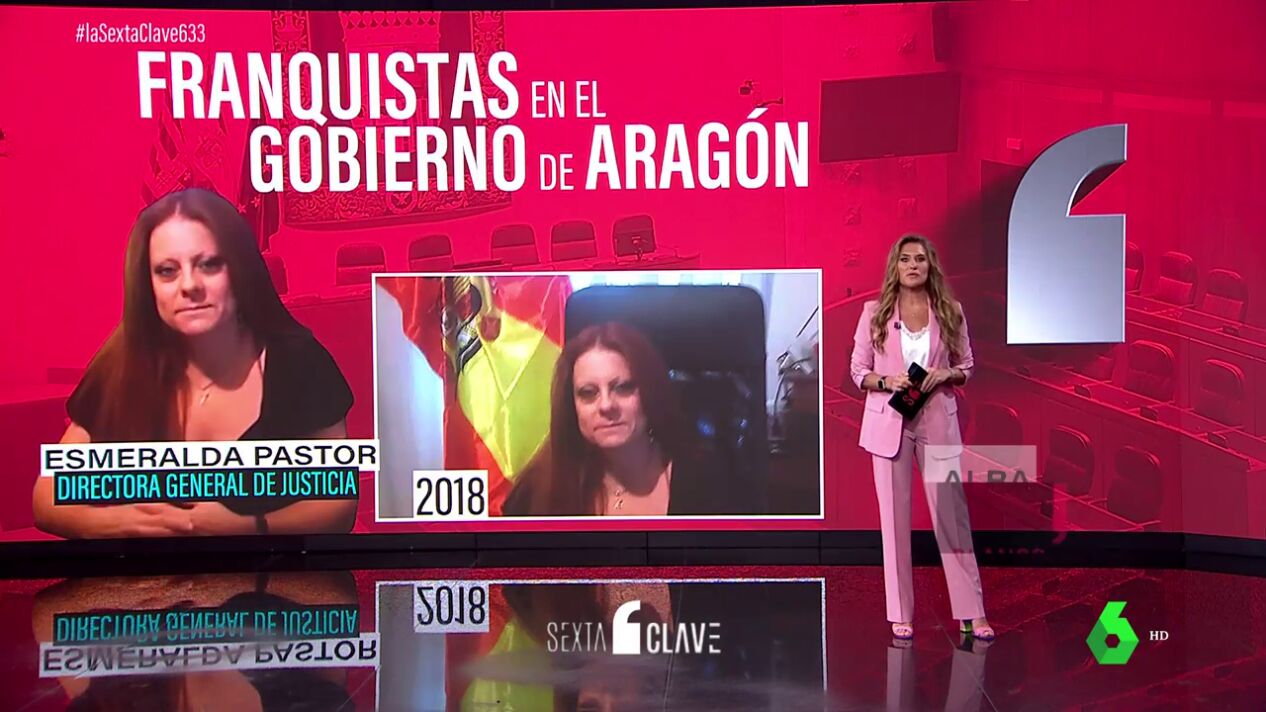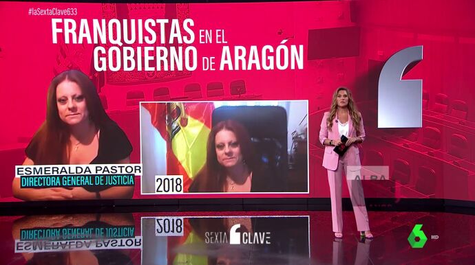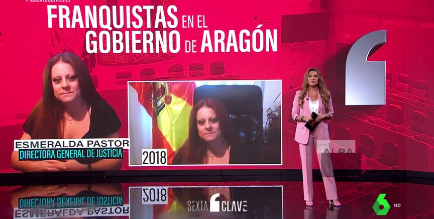 Ellos son Esmeralda Pastor y Jorge Valero. La primera es abogada de profesión y actual directora de Justicia. Pastor mantuvo desde 2018 en su perfil de Facebook una fotografía suya con la bandera franquista en su despacho. Una imagen que sustituyó dos años más tarde por la misma foto, pero sin el escudo del águila, para simular que se trata simplemente de una bandera de España. Entre sus publicaciones también hay alabanzas a la labor del dictador Francisco Franco, como un artículo en el que enumeraba sus logros bajo el título "el gran dictador". Y en la misma línea, ensalzamientos a uno de sus ministros, criticando que el Gobierno le haya retirado la medalla al mérito al trabajo.