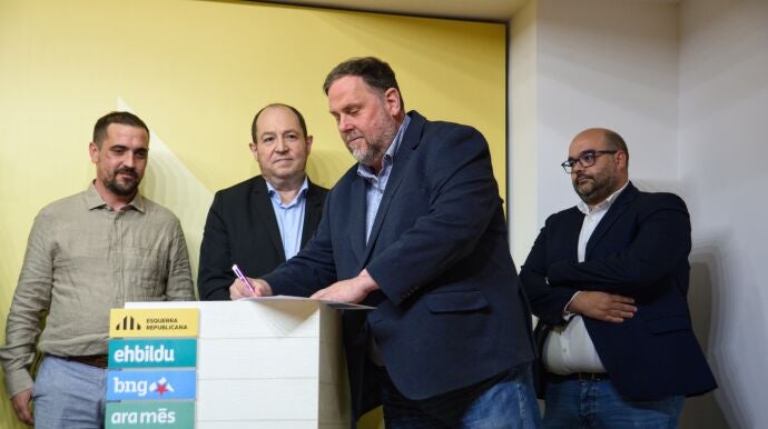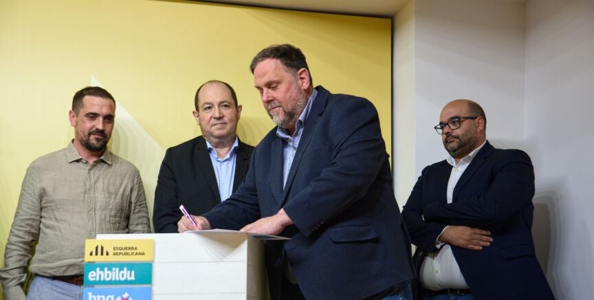El presidente de ERC, Oriol Junqueras; el cabeza de lista de EH Bildu al Parlamento Europeo, Pernando Barrena; el responsable de Relaciones Internacionales de la ejecutiva del BNG, Rubén Cela, y el coordinador de Ara Més, Mateu Mates, han firmado este jueves el acuerdo de la coalición 'Ara Repúblicas' para concurrir a las elecciones europeas y han reivindicado el trabajo hecho en esta legislatura.