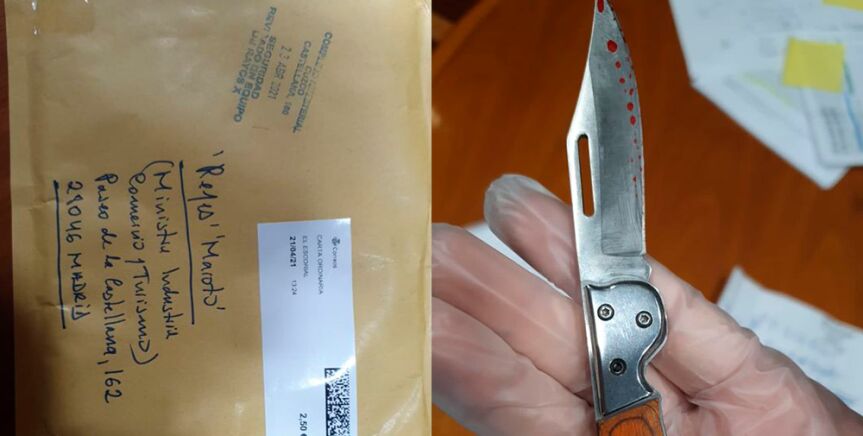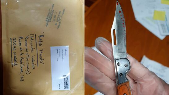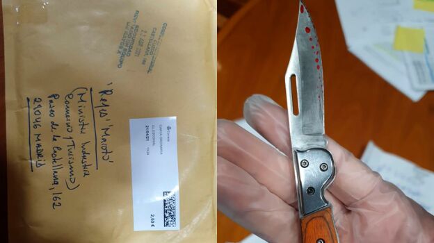 Una carta con una navaja aparentemente ensangrentada en su interior. Es la amenaza que ha recibido la ministra Reyes Maroto en su despacho, ubicado en el Ministerio de Industria. La navaja estaba envuelta entre dos CDs, previsiblemente como estrategia para esquivar los sistemas de detección. Y en el envío no solo estaba la navaja, sino también se han encontrado recortes de varios periódicos, una carta manuscrita y algunas capturas de WhatsApp.