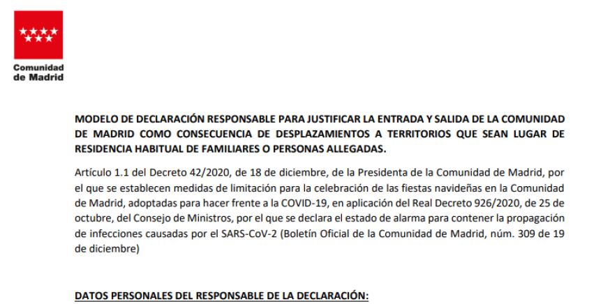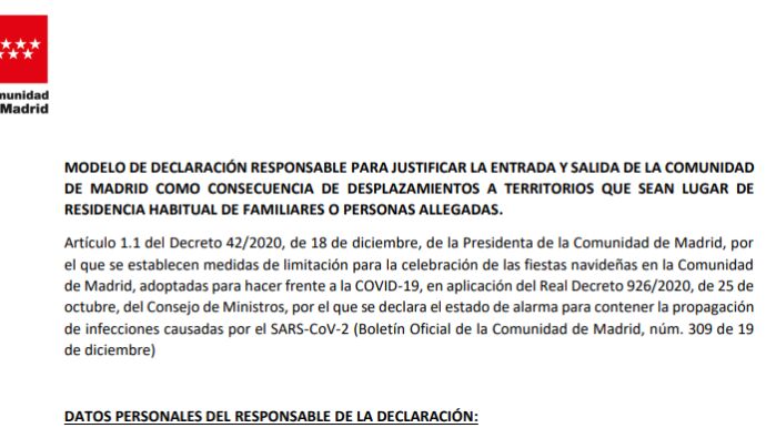 La Comunidad de Madrid ha puesto a disposición de los ciudadanos el modelo de declaración responsable con el que los ciudadanos podrán justificar sus salidas y entradas en la región para pasar las Navidades con familiares o allegados y evitar las sanciones derivadas de las restricciones para luchar contra la pandemia del coronavirus.