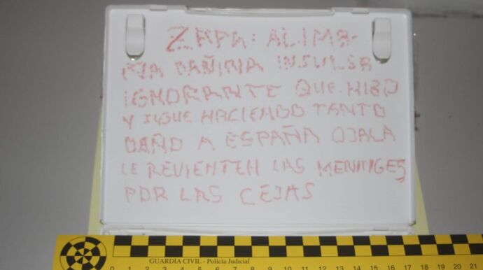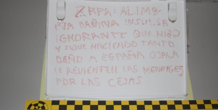 La carta interceptada por Correos con varios cartuchos de 38 mm adjunta una nota con un mensaje amenazante hacia el expresidente Zapatero. "Zapa. Alimaña dañina, insulsa. Ignorante que hizo y sigue haciendo tanto daño a España. Ojalá le revienten las meninges por las cejas", reza la nota.