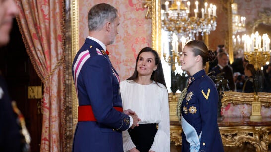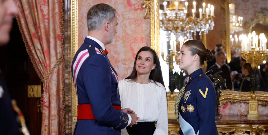 Los reyes, acompañados de su hija Leonor, han presidido en el Palacio Real la tradicional Pascua Militar, ceremonia castrense que se celebra cada 6 de enero y en la que, por primera vez Felipe VI y la princesa de Asturias, han coincidido en vestir el uniforme del Ejército del Aire y el Espacio. Casualidad que obedece a que el rey cada año viste el uniforme de gala de un ejército diferente: Tierra, Armada o Aire, rotando para representar a todos, bajo el rango de capitán general.