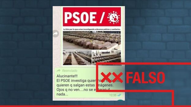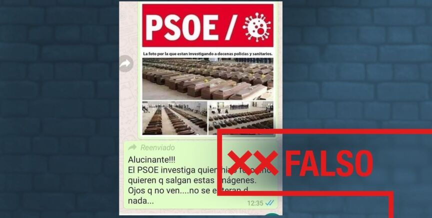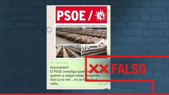 "La fotografía pretende dar a entender que las decenas de ataúdes contienen muertos ocasionados en España por el Covid-19, y que esta realidad se pretende esconder por el principal partido del Gobierno de España para generar así indignación social mediante la utilización de personas fallecidas", apunta la denuncia.