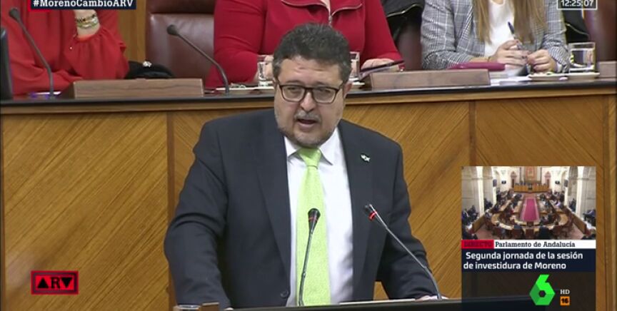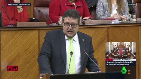El líder de Vox en Andalucía, Francisco Serrano, ha aprovechado su turno de palabra en el debate de investidura de Juanma Moreno para explicar las inspiraciones históricas de su partido: "Somos muy diferentes de los radicales extremistas de izquierda, nos basamos en la ideología de un revolucionario que vivió hace más de 2000 años y que basaba toda su doctrina en el amor, San Juan".