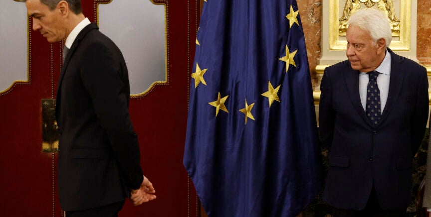Una de las imágenes de este martes ha sido el breve encuentro entre el presidente del Gobierno, Pedro Sánchez, y el expresidente Felipe González después de que este asegurara la semana pasada que si el líder del PSOE se presenta a las próximas elecciones, votará en blanco.