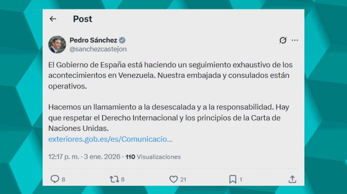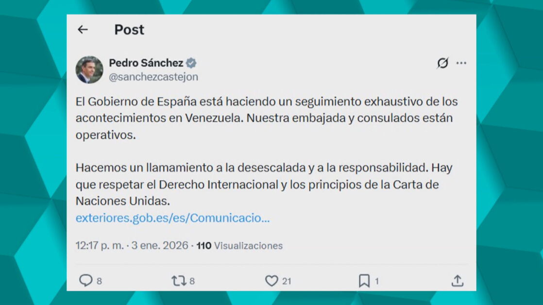 Pedro Sánchez, en ese sentido, ha compartido en redes un mensaje en el que afirma que están haciendo "un seguimiento exhaustivo de los acontecimientos en Venezuela".