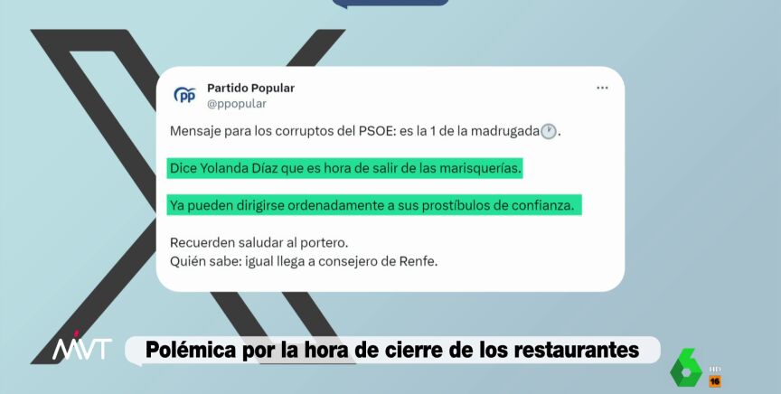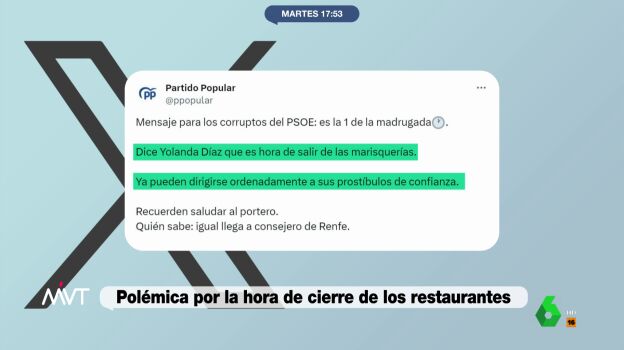 Pasaban dos minutos, de la una de la madrugada de este martes cuando apareció el mensaje que desde la formación socialista han tachado de "indecente". En la publicación que se avisaba a los "corruptos del PSOE" de la hora que era, en referencia, a las palabras de la líder de Sumar. De hecho, lo explican en la siguiente línea del mensaje: "Dice Yolanda Díaz que es hora de salir de las marisquerías".