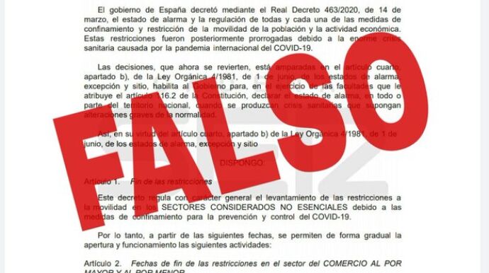 "España sigue en una fase de confinamiento ante el COVID-19 y no se ha iniciado aún la desescalada. Circulan falsas informaciones en torno a las restricciones del estado de alarma. Confía siempre en fuentes oficiales", aseguran.