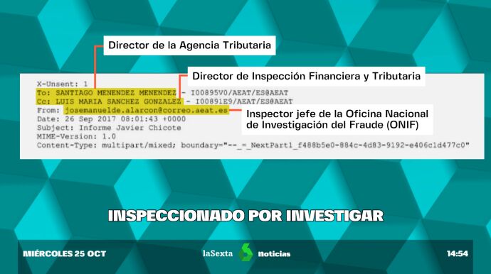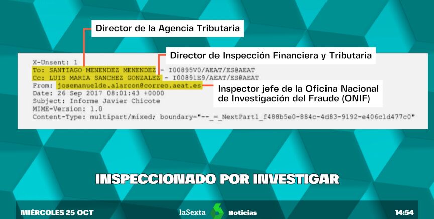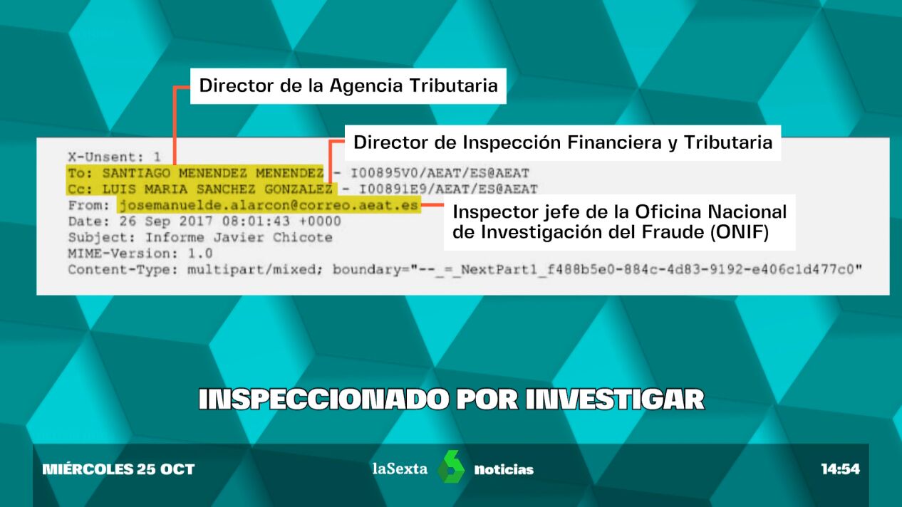 Para entenderlo volvemos a septiembre de 2017. En un correo al que ha tenido acceso laSexta aparecen tres importantes interlocutores: el inspector jefe de la Oficina Nacional de Investigación de Fraude (ONIF), el director de la Agencia Tributaria y el director de Inspección Financiera y Tributaria. El documento que adjuntan lleva nombre propio 'informe Chicote'.