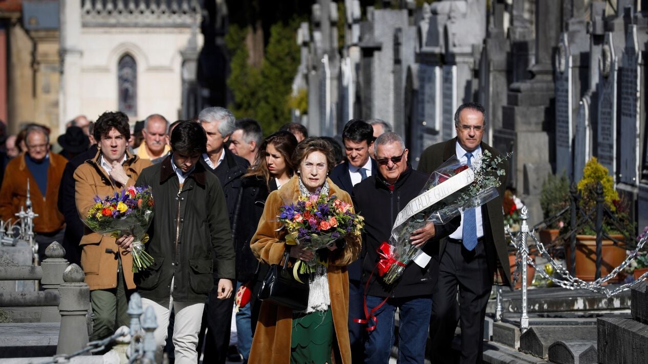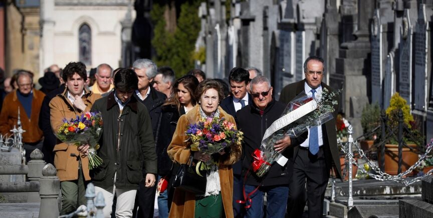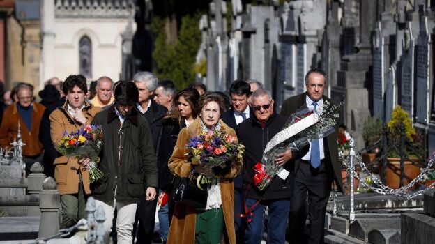 Numerosos familiares y amigos del fallecido, entre ellos su viuda María del Carmen Heras acompañada de sus hijos, han acudido al homenaje organizado por el PSE-EE en el cementerio de Polloe en San Sebastián para recordar al abogado asesinado en 1996.