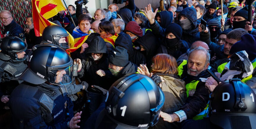 Cuando este grupo tomaba dirección a la plaza Urquinaona, epicentro de los graves disturbios desatados en 2019 con motivo de las protestas contra la sentencia del procés, y gritaban "lo volveremos a hacer", las fuerzas y cuerpos de seguridad del estado organizaban un cordón policial para impedir el paso. Ahí se han producidomomentos tensos entre empujones y forcejeos.
