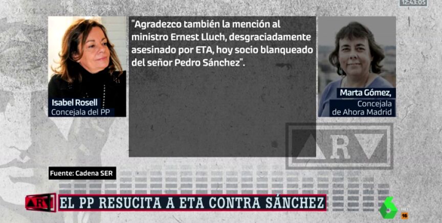 Su afirmación ha indignado a la concejala de Ahora Madrid Marta Gómez, quien le ha exigido que rectifique: "Decir que el Gobierno de Pedro Sánchez, del PSOE, está blanqueando el terrorismo es una ignominia, una falsedad, y mucho más traerlo a colación mencionando el asesinato de Ernest Lluch", le ha reprochado.