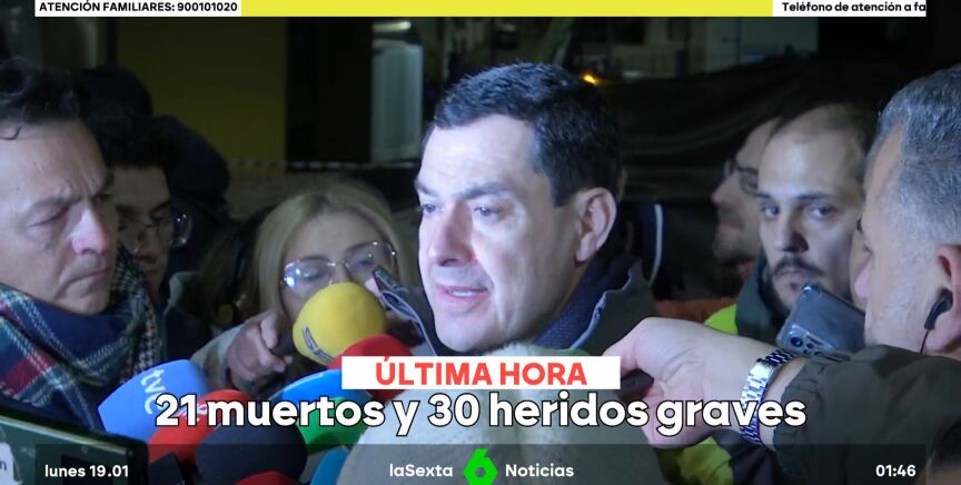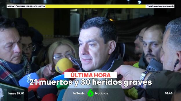Así, Moreno ha querido trasladar su "pésame a los familiares de las personas que han perdido su vida en esta calamidad, esta catástrofe", al tiempo que ha subrayado que los equipos de rescate van a seguir trabajando sin descanso en las próximas horas para tratar de "excarcelar los cuerpos" que todavía quedan atrapados tras el accidente.