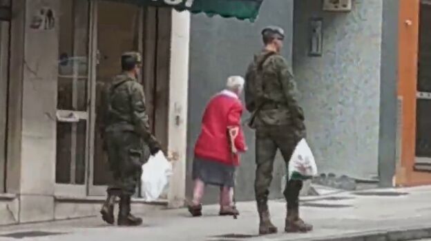 En el vídeo se ve cómo dos militares llevan en Gijón las bolsas de la compra a una anciana, quien camina junto a ellos con la ayuda de una muleta. "¡Qué grandes son!", destaca la mujer que graba el momento.
