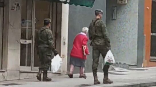 En el vídeo se puede ver cómo dos militares llevan la compra a una anciana. En una calle de Gijón, ambos acompañan a la mujer, quien, con la ayuda de una muleta, camina a su lado. Por su parte, la mujer que graba el momento agradece a los militares su labor: "¡Qué grandes son!".