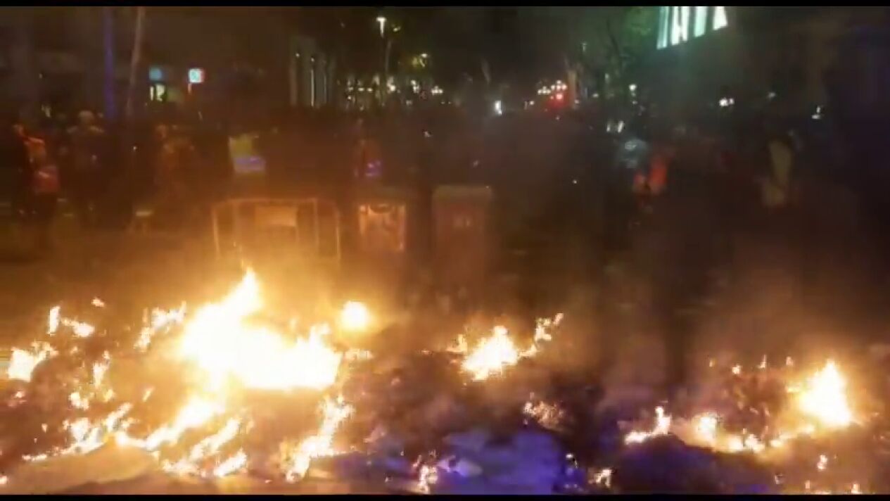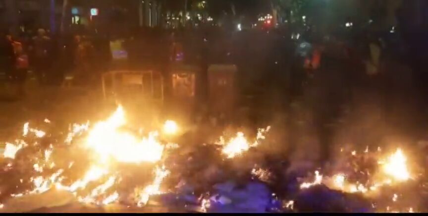 La tensión se recrudece en la Delegación del Gobierno de Barcelona. Allí, múltiples manifestantes han roto a patadas las vallas que les separaban de los Mossos d'Esquadra. Tras arrojar varios objetos, incluidas bengalas y petardos, los agentes han comenzado las cargas policiales y los manifestantes han llegado a prender fuego a una barricada.