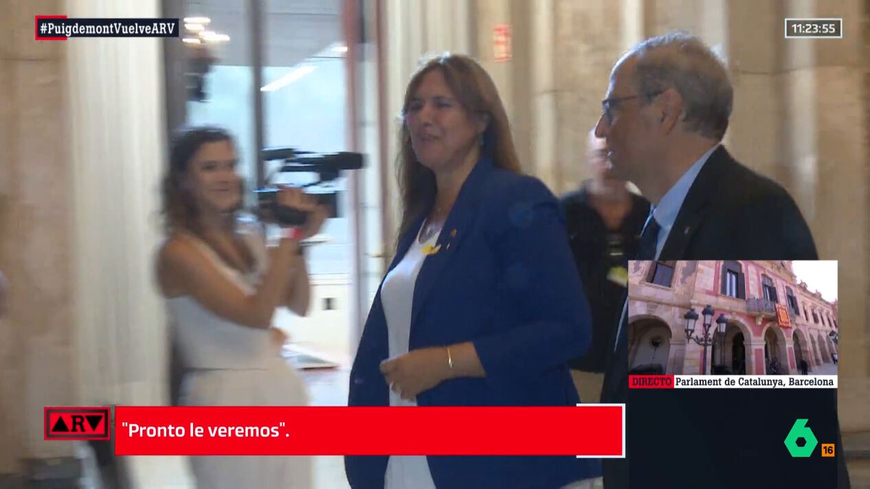 Hasta en dos ocasiones, la presidenta de Junts Laura Borràs ha insistido en que "veremos pronto" a Carles Puigdemont después de que haya desaparecido del radar tras su breve regreso a ante una multitud congregaba en las inmediaciones del Parlament.