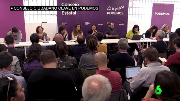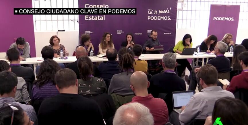Consejo ciudadano estatal de Podemos tras la crisis abierta por la marcha de Íñigo Errejón. Pablo Iglesias interviene por teléfono después de publicar una contundente carta.