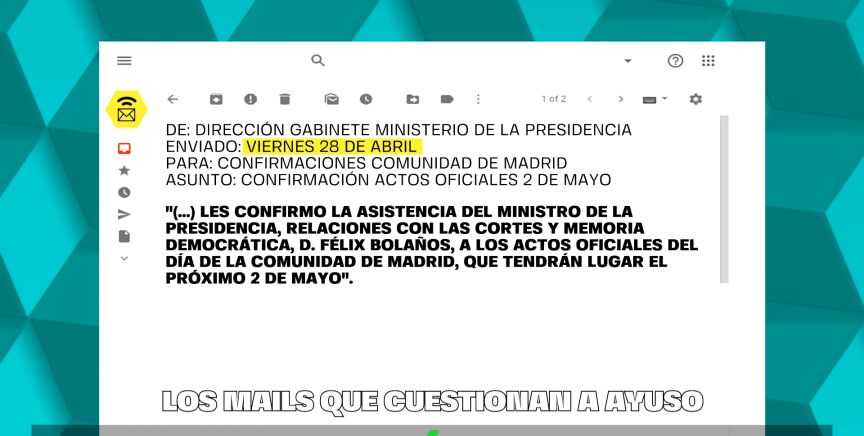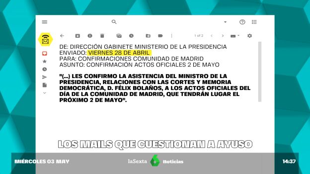 Sin embargo, las pruebas la desmienten. laSexta ha tenido acceso a los mails enviados desde la dirección del gabinete de Presidencia. En ellos se puede ver la comunicación entre el gobierno madrileño y el ministerio encabezado por Bolaños.