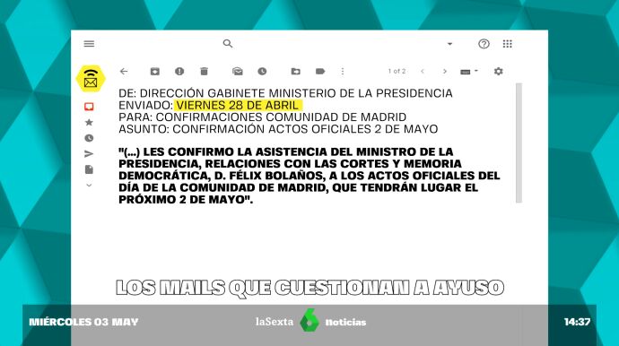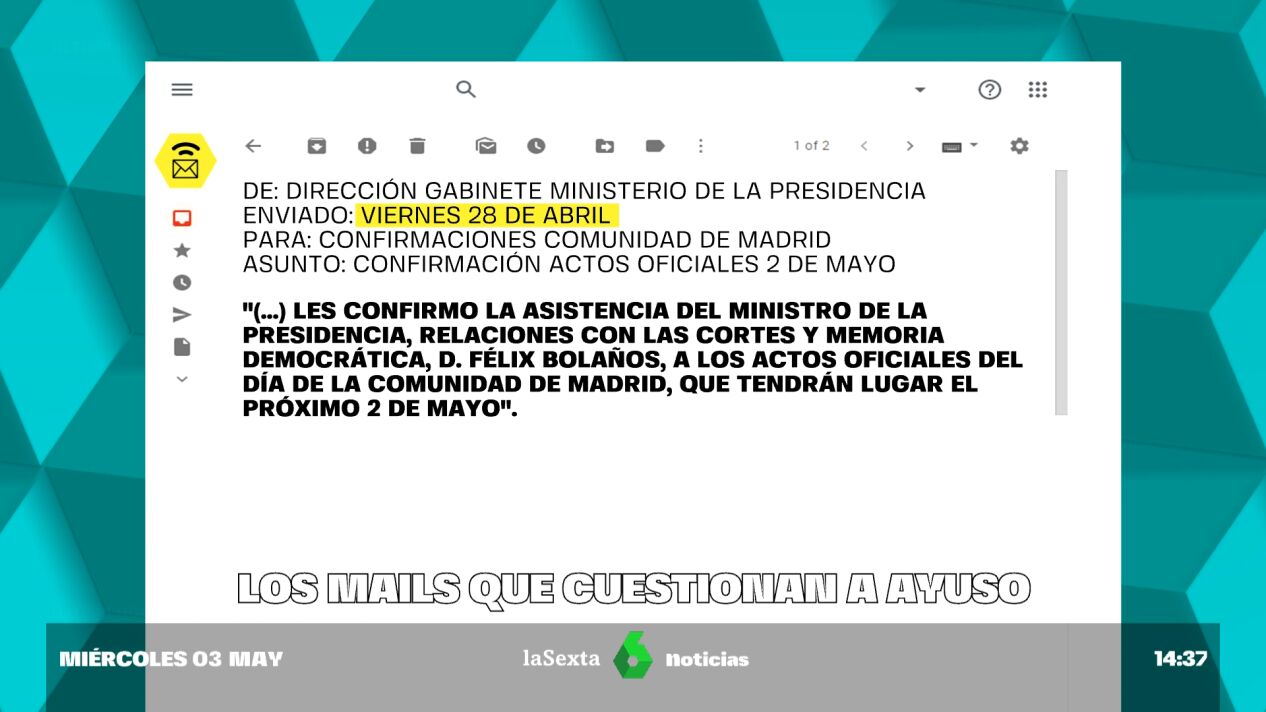 LaSexta ha tenido acceso a los mails que envió el equipo de Bolaños y contradicen lo que ha dicho la presidenta madrileña. El ministro de Presidencia habría pedido ir como invitado, nada más. Aunque hoy Ayudo ha insistido en que Bolaños quería presidir el acto.