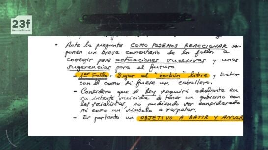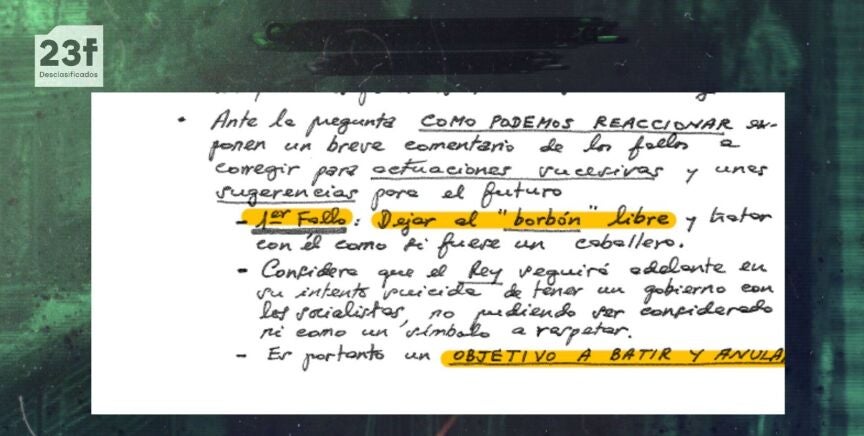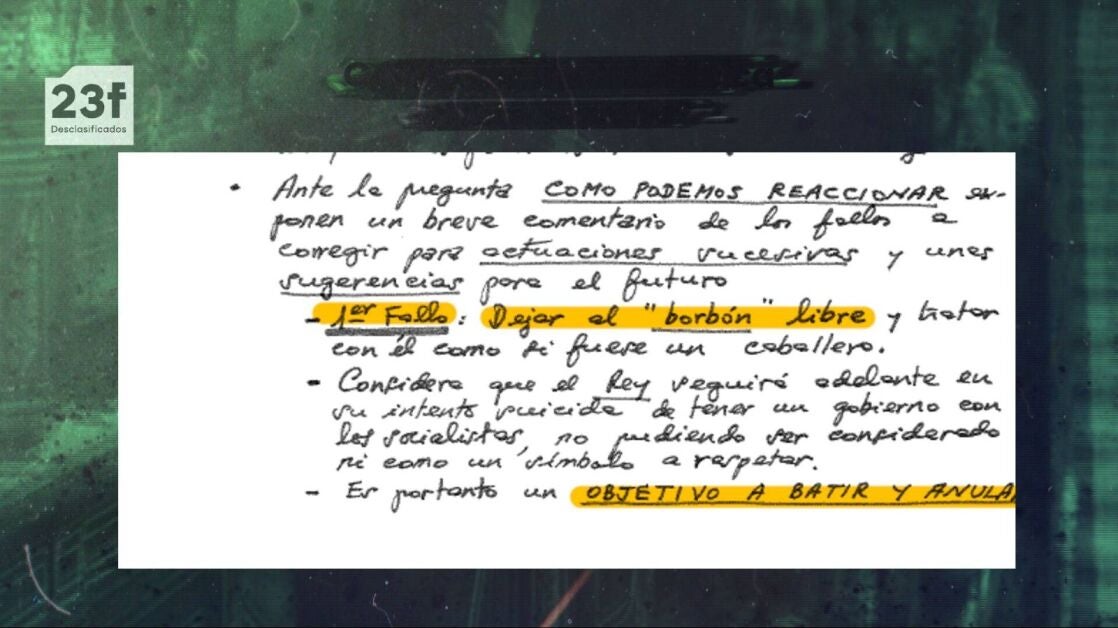 El archivo, manuscrito y anónimo, establece además como sugerencia tras el fracaso de la intentona del 23F y para "actuaciones sucesivas" considerar al rey Juan Carlos I un "objetivo a batir y anular". Esta recomendación se incluye en un apartado titulado "Militares españoles dan unas consignas sobre lo que se debe hacer después del 23F".