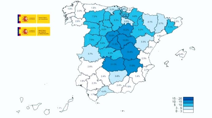 - Castilla-La Mancha: Guadalajara (10,9%) Toledo (9,3%), Cuenca (13,5%), Ciudad Real (11,1%) y Albacete (11,5%)