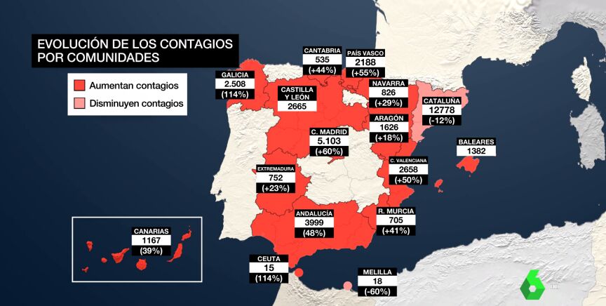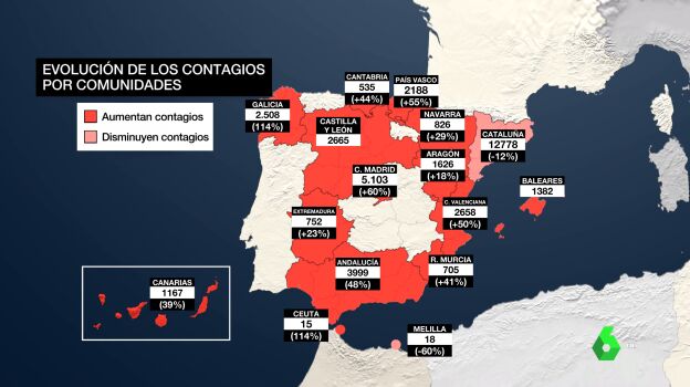Estas solo ofrecen datos los sábados. Por su parte, los aumentos más bajos de dichos datos de incidencia se han registrado en Navarra (con 826 casos, +29%), Extremadura (752 casos, +23%) y Aragón (1.626, +18%). En esta línea, solo dos territorios autonómicos logran bajan sus cifras epidemiológicas: Melilla, drásticamente, tras el brote de la semana pasada (18 casos, -60%), y Cataluña (12.778 casos, -12%). Paradójicamente, es en el territorio catalán donde más preocupa la presión hospitalaria.