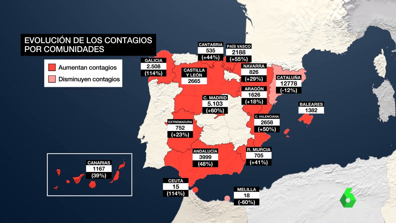 Los datos de contagios por coronavirus en España siguen siendo sumamente preocupantes. Un fin de semana más, nuestro país vuelve a batir récord en esta quinta ola: 40.645 nuevos casos. Así evolucionan por comunidades: Galicia, con 2.508 casos (+114%), y Ceuta, con 15 (+114%), duplican sus datos. Le siguen, con subidas en el entorno del 50%, autonomías como Madrid (5.103 casos, +60%), País Vasco (2.188 casos, +55%), Comunidad Valenciana (2.658, +50%), Andalucía (3.999, +48%), Cantabria (535, +44%), Murcia (705, +41%) o Canarias (1.167, +39%).