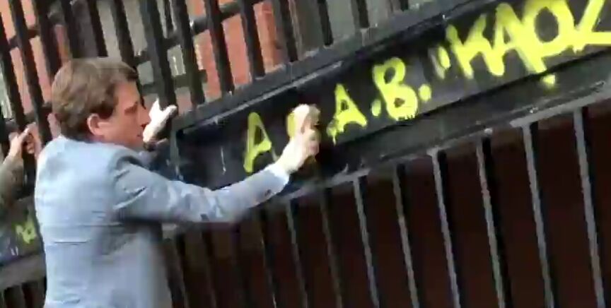 Martínez-Almeida 'borra' con un cepillo una pintada contra la Policía en Vicálvaro