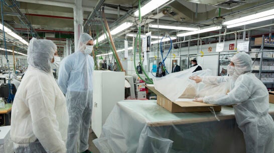 Ataviados con mascarilla, guantes y traje protector, el presidente del Gobierno y la ministra de Industria han visitado las instalaciones de El Corte Inglés en Madrid en las que se están elaborando mascarillas.