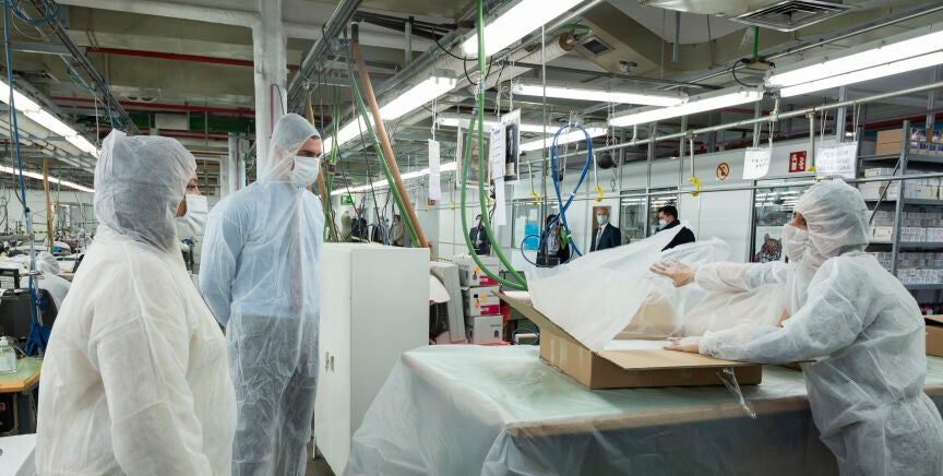 El presidente del gobierno, Pedro Sánchez, y la ministra de Industria, Comercio y Turismo, Reyes Maroto, han realizado una visita a los talleres de confección de El Corte Inglés en Madrid para seguir los trabajos del equipo que elabora mascarillas para su distribución en España.