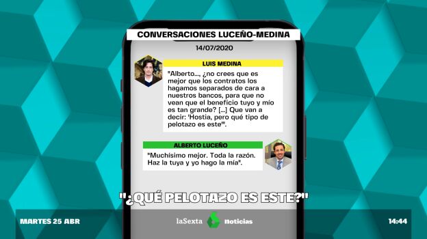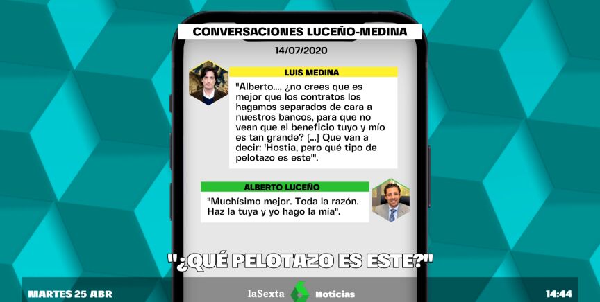 En mensajes de WhatsApp intercambiados entre ambos en 2020, Luis Medina llega incluso a proponer a su compañero hacer los contratos por separado "de cara" a sus bancos: "Que van a decir, 'hostia, pero qué tipo de pelotazo es este'", llegó a decirle en un audio.
