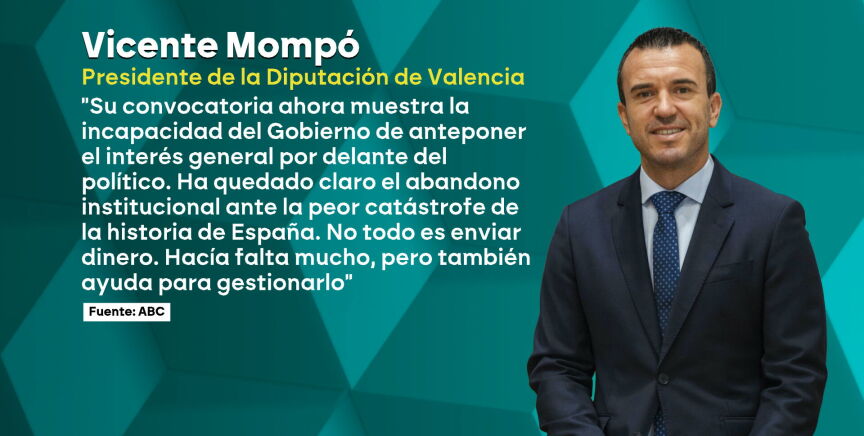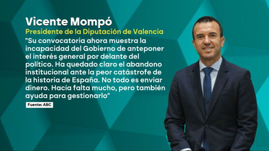 Esta vez es Vicente Mompó, presidente de la Diputación de Valencia y líder provincial del PP, quien insiste en que el Gobierno antepuso su interés partidista a las necesidades de Valencia. Lo hace en una entrevista para 'ABC' en la que asegura que Mazón ha sido el único en asumir responsabilidades políticas por la DANA cuando, sostiene, no debería ser el único en hacerlo.